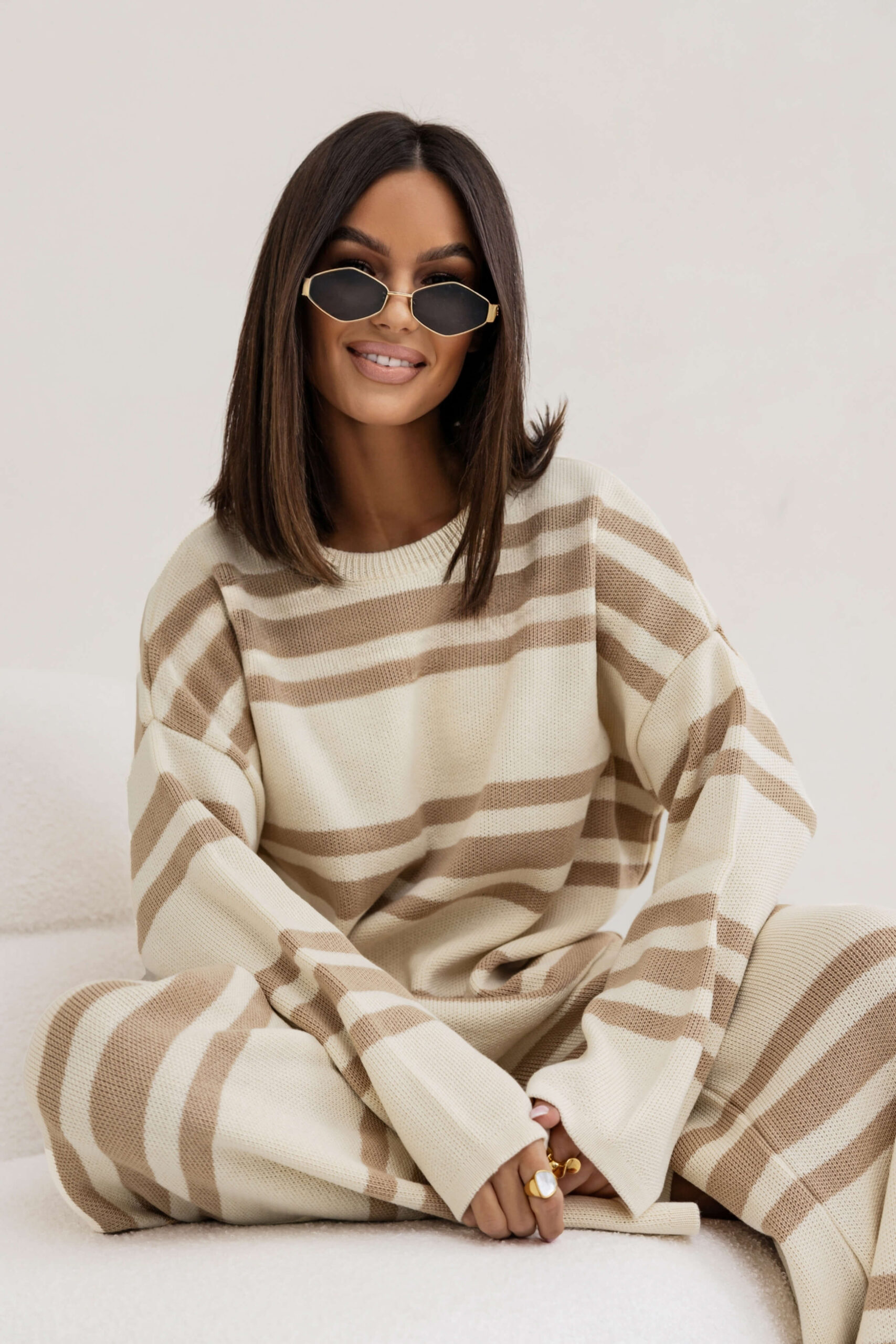 Komplektas Willow Beige – tai nepriekaištingas komforto ir stiliaus derinys, sukurtas moterims, vertinančioms patogumą ir eleganciją. Šis megztas laisvalaikio komplektas susideda iš laisvai krintančio megztinio ir plačių kelnių, kurie kartu sukuria lengvą, tačiau prabangų įvaizdį. „Willow Beige“ atspalvis suteikia švelnumo ir elegancijos, todėl puikiai tinka kasdieniam dėvėjimui arba jaukioms savaitgalio akimirkoms.