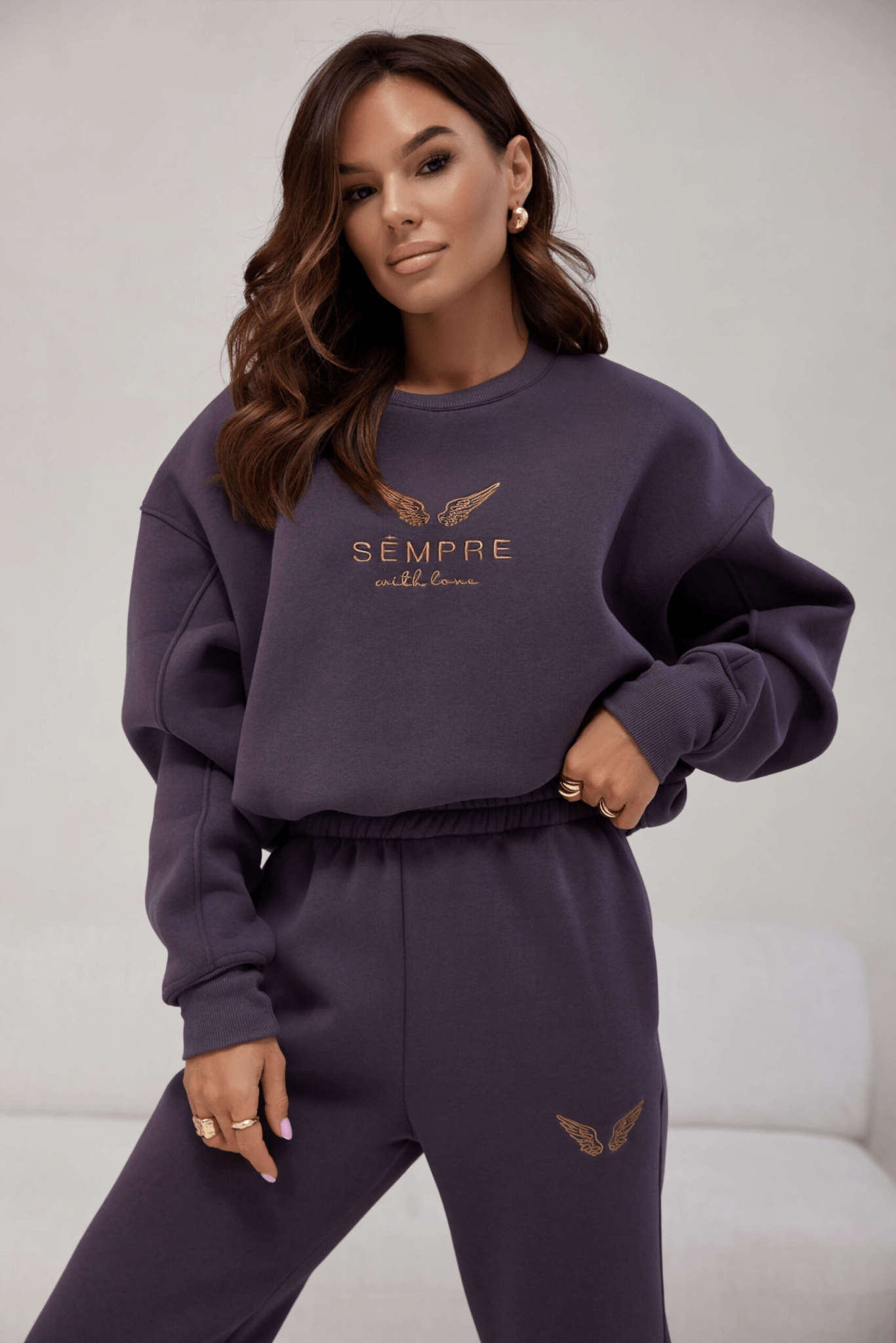 Džemperis yra laisvo silueto, todėl nevaržo judesių ir leidžia jaustis patogiai visą dieną. Minimalistinį dizainą puošia subtilūs siuvinėti logotipai, kurie suteikia išskirtinumo ir prabangos įspūdį. Tiesus džemperio kirpimas, ilgintos rankovės bei patogus ilgis užtikrina universalumą – jis dera tiek prie komplekte esančių kelnių, tiek prie džinsų ar sijonų.