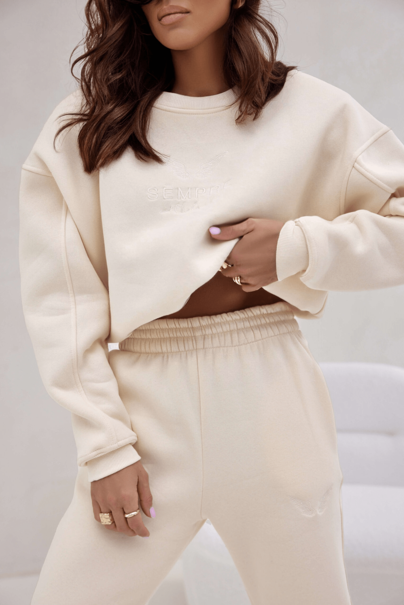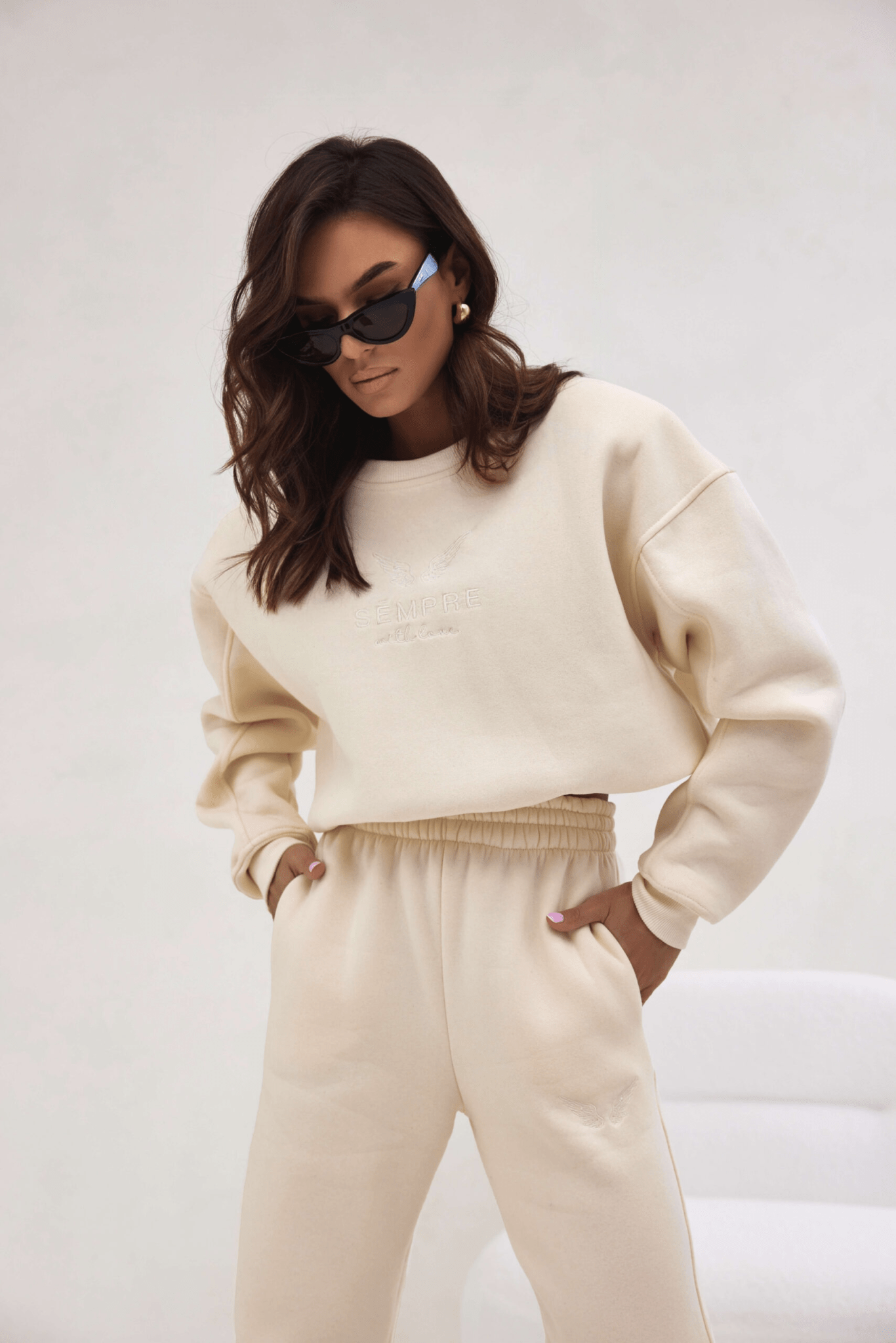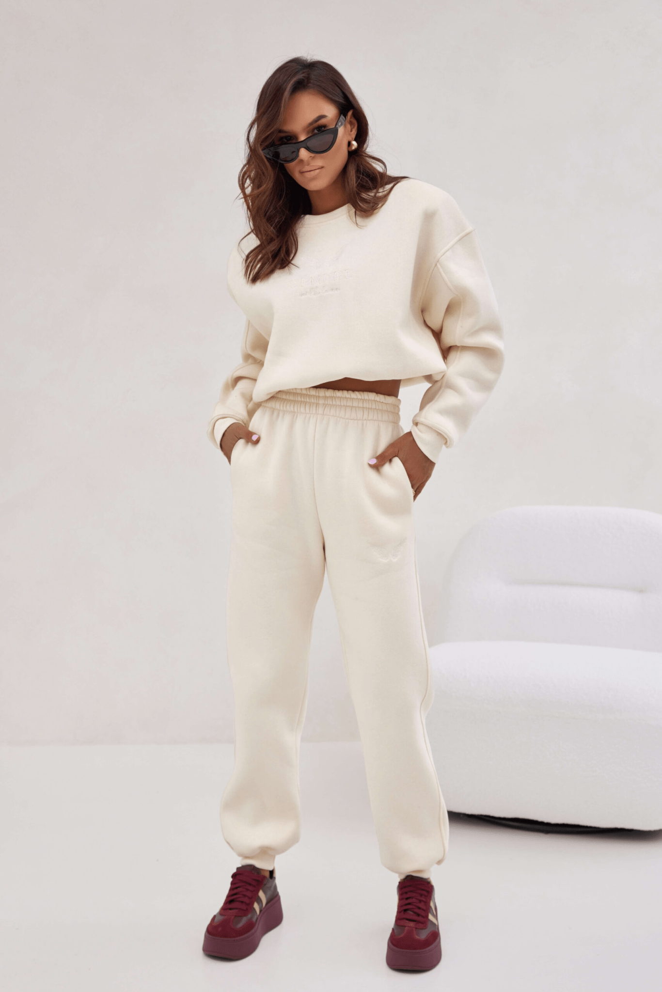 Viršutinė dalis – laisvo („oversize“) kirpimo džemperis su subtiliai siuvinėtu logotipu priekyje. Šis minimalistinis akcentas suteikia prabangos pojūtį, o elastingi rankogaliai neleidžia prasiskverbti šalčiui ir užtikrina komfortą.