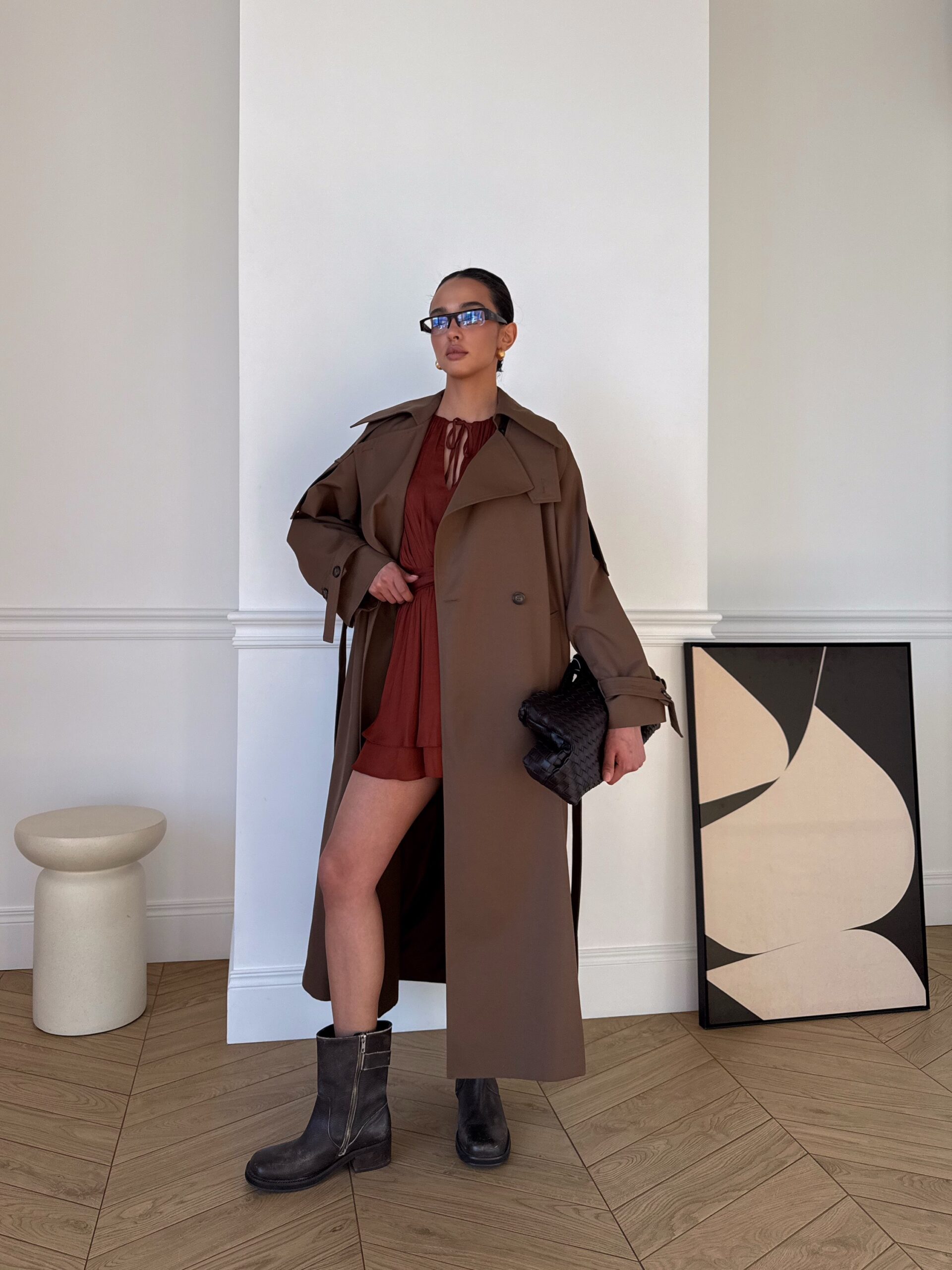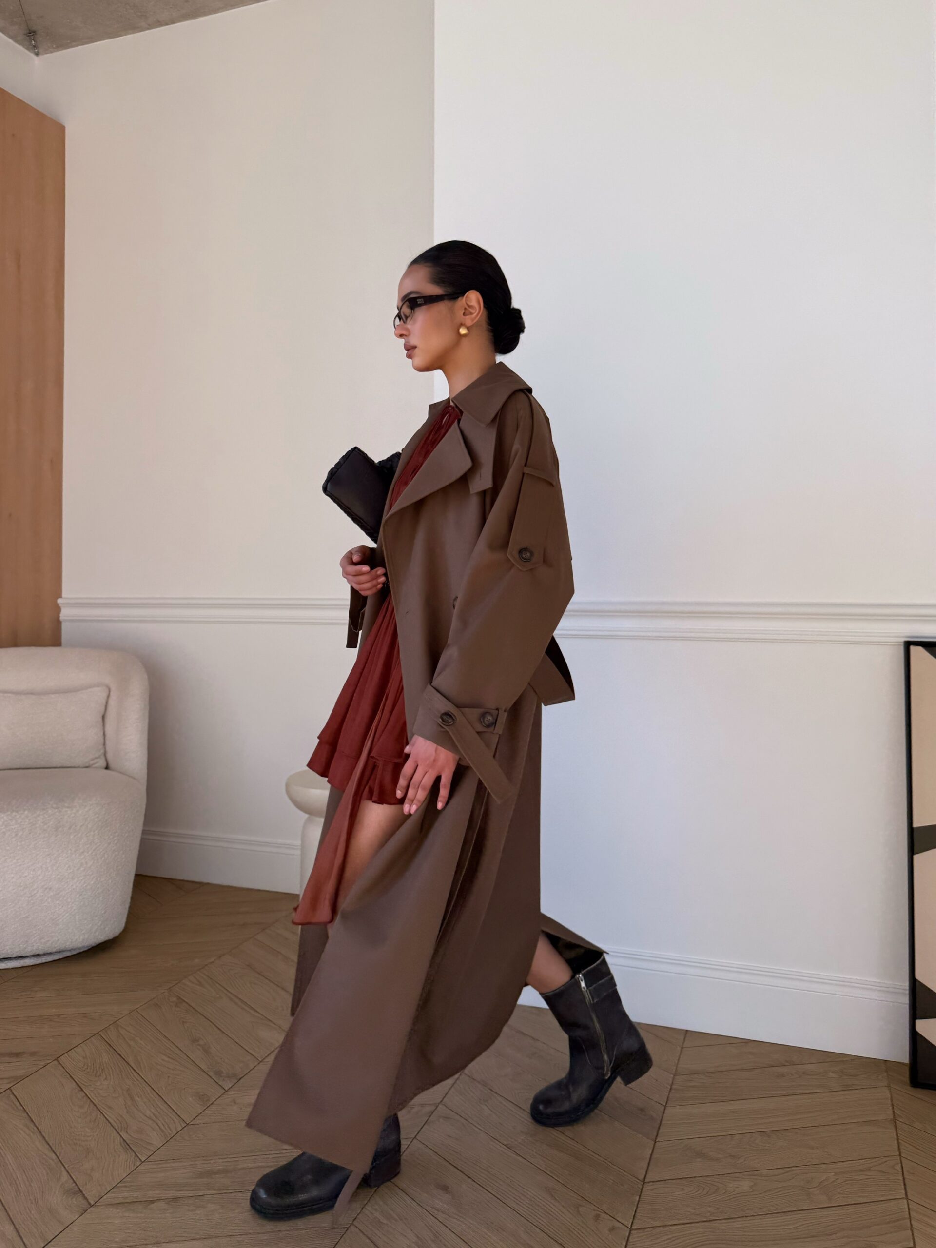 Premium kokybės audinys yra tvirtas, puikiai laiko formą ir maloniai priglunda prie kūno, todėl paltas išlaiko nepriekaištingą siluetą visos dienos metu. Idealiai tinka pavasario ir rudens sezonui, kai norisi komforto, bet kartu ir stiliaus.