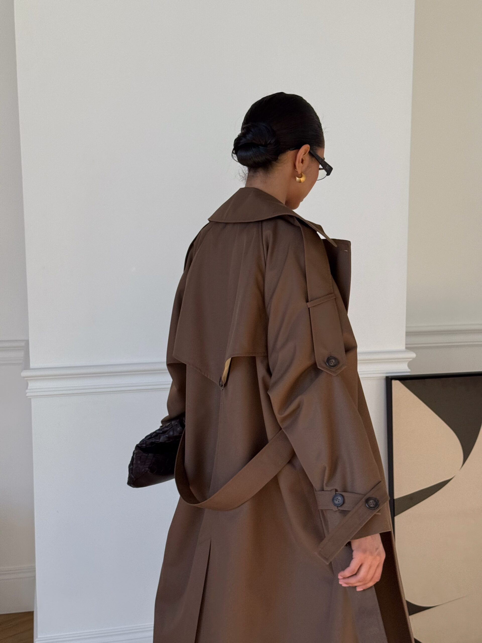 Detalės – rankovių dirželiai, dekoratyviniai elementai bei klasikinė nugaros konstrukcija – kuria išbaigtą, premium lygio dizainą. Tai paltas, kuris atrodo brangiai ir išskirtinai be papildomų pastangų.