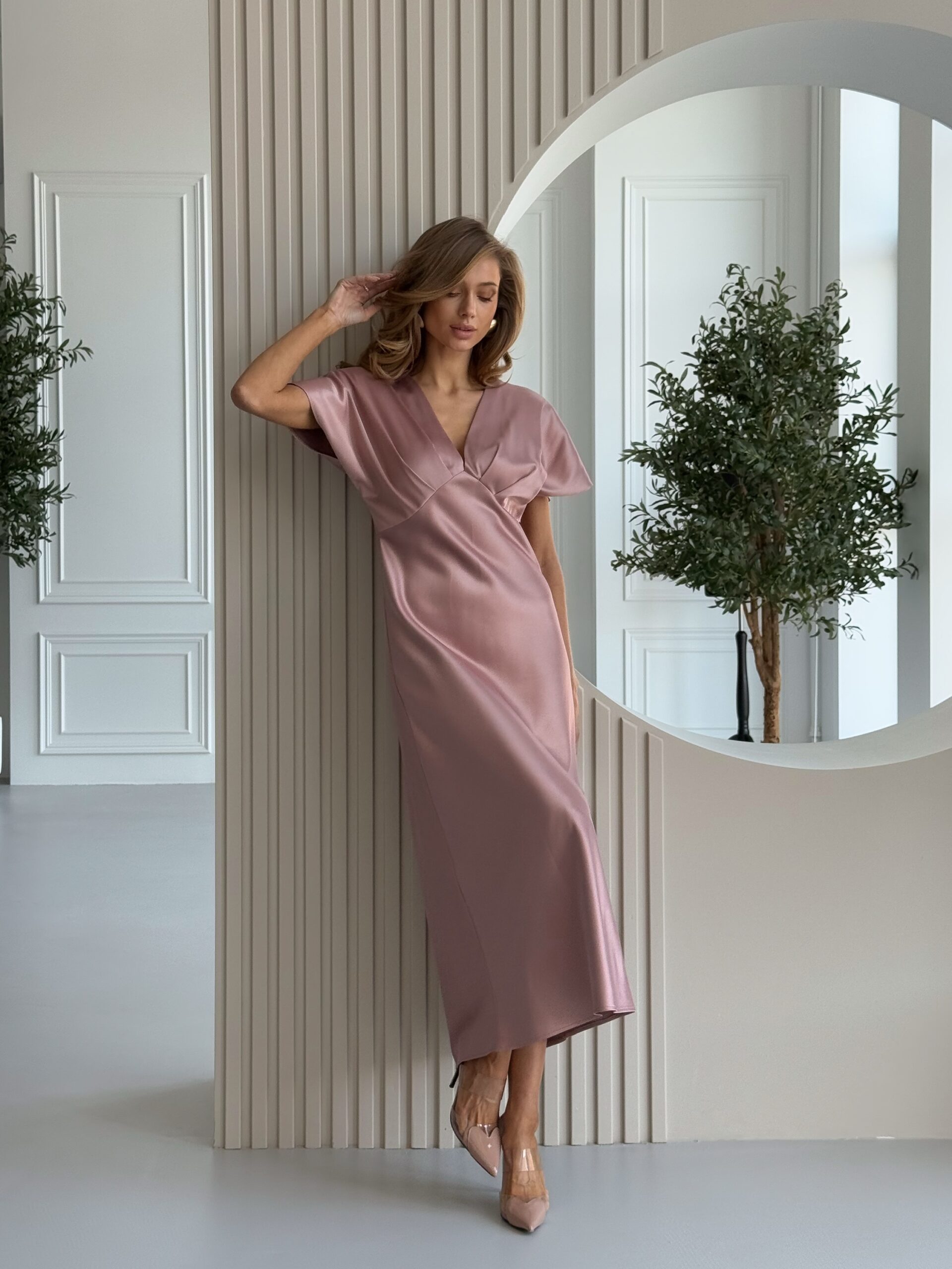 Elegantiška pudros rožinės spalvos midi ilgio suknelė – subtilus ir itin moteriškas pasirinkimas ieškančioms rafinuoto įvaizdžio ypatingoms progoms. Šis modelis išsiskiria lengvai krintančiu, švelniai blizgiu satino audiniu, kuris suteikia prabangos pojūtį ir gražiai atsiskleidžia judesyje. Suknelės siluetas dailiai pabrėžia figūrą, o kartu išlaiko lengvumą ir eleganciją.